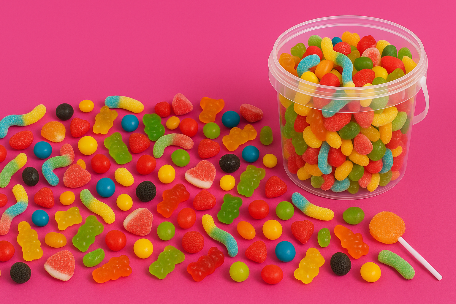 Un grand seau rempli de délicieux bonbons variés : gélifiés, fruités et acidulés.Avec ses 3,67 kg de douceurs, c’est le choix idéal pour les fêtes, anniversaires ou moments de partage.